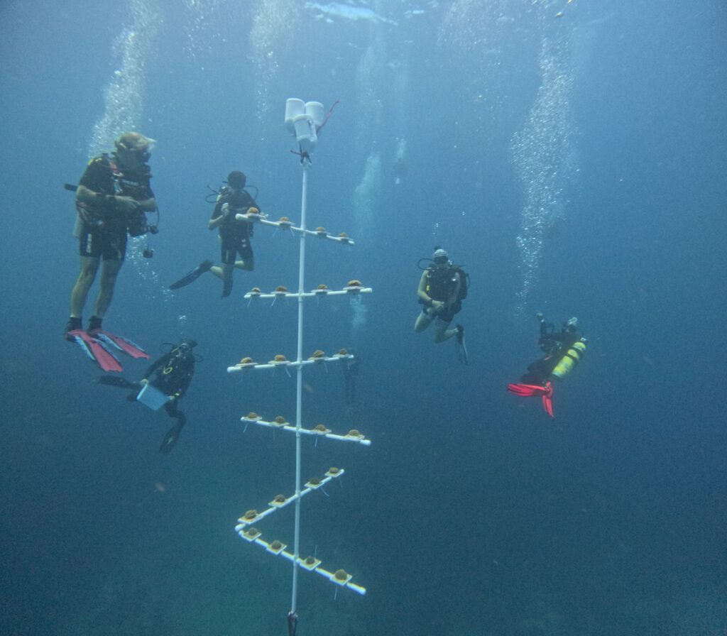 - We installed the first coral spawning hub (nursery tree) on Dangleben’s Pinnacles