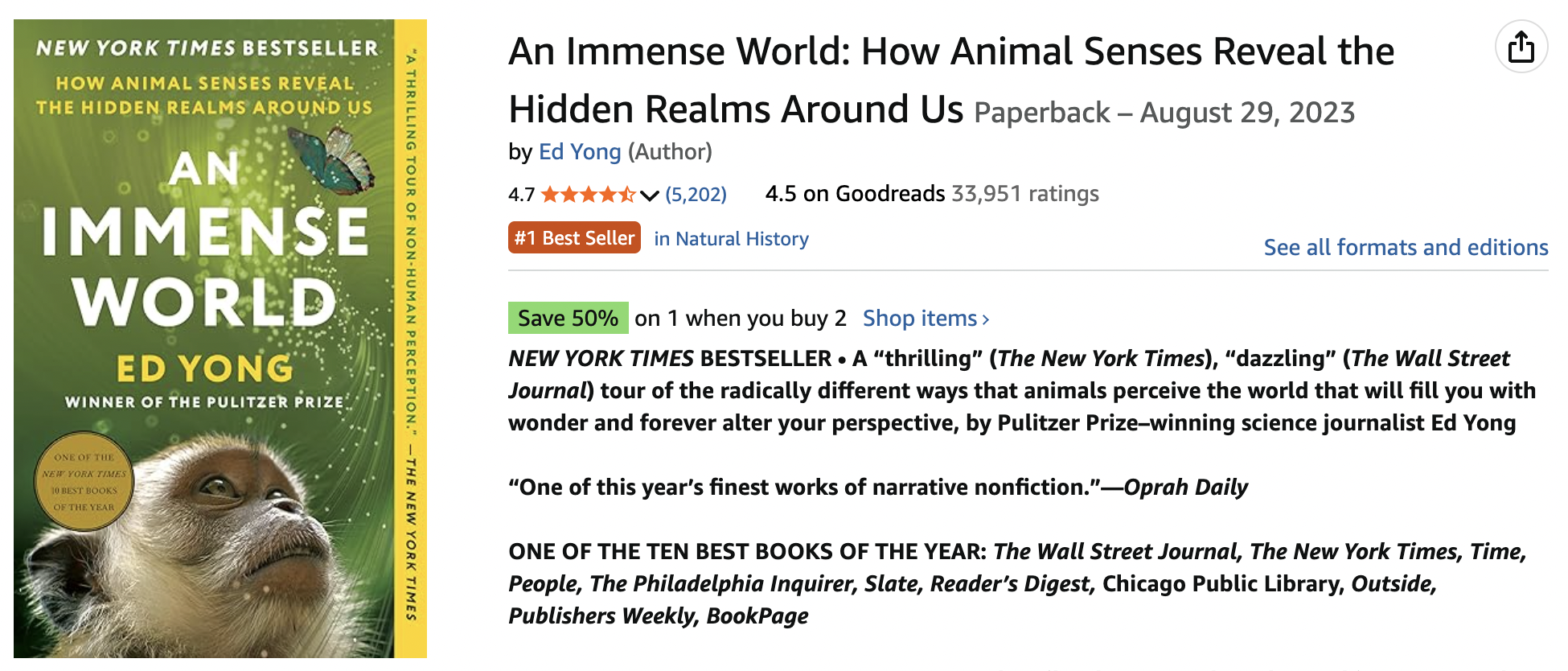 This book welcomes us into a previously unfathomable dimension – the world as it is truly perceived by other animals. We encounter beetles that are drawn to fires, turtles that can track the Earth’s magnetic fields, fish that fill rivers with electrical messages, and humans who wield sonar like bats. We discover that plants thrum with the inaudible songs of courting bugs and that even simple scallops have complex vision. We learn what bees see in flowers, what songbirds hear in their tunes, and what dogs smell on the street. Throughout, acclaimed science journalist Ed Yong coaxes us beyond the confines of our own senses, showing us that to understand our world we don’t need to travel to other places – we need to see through other eyes.